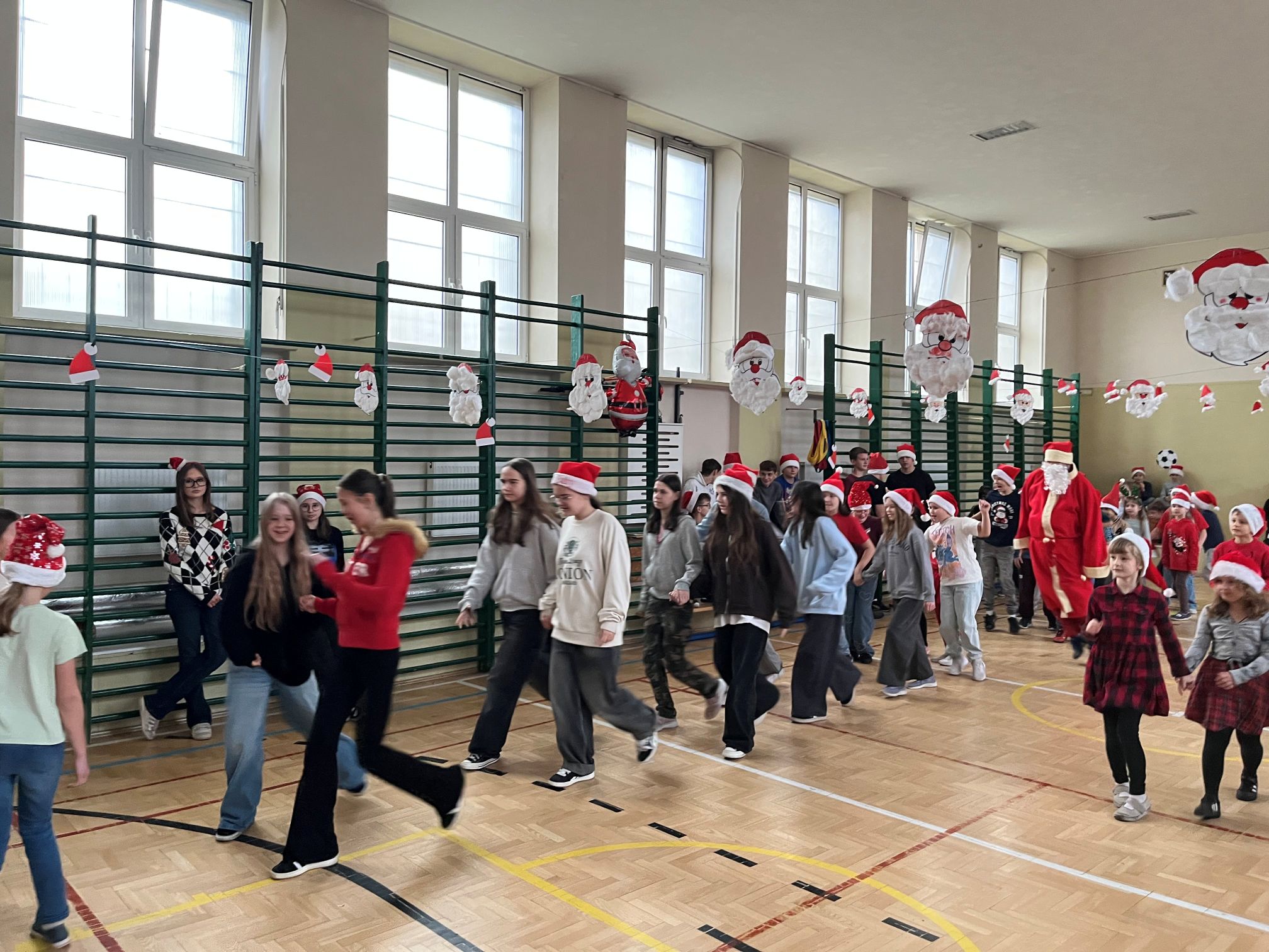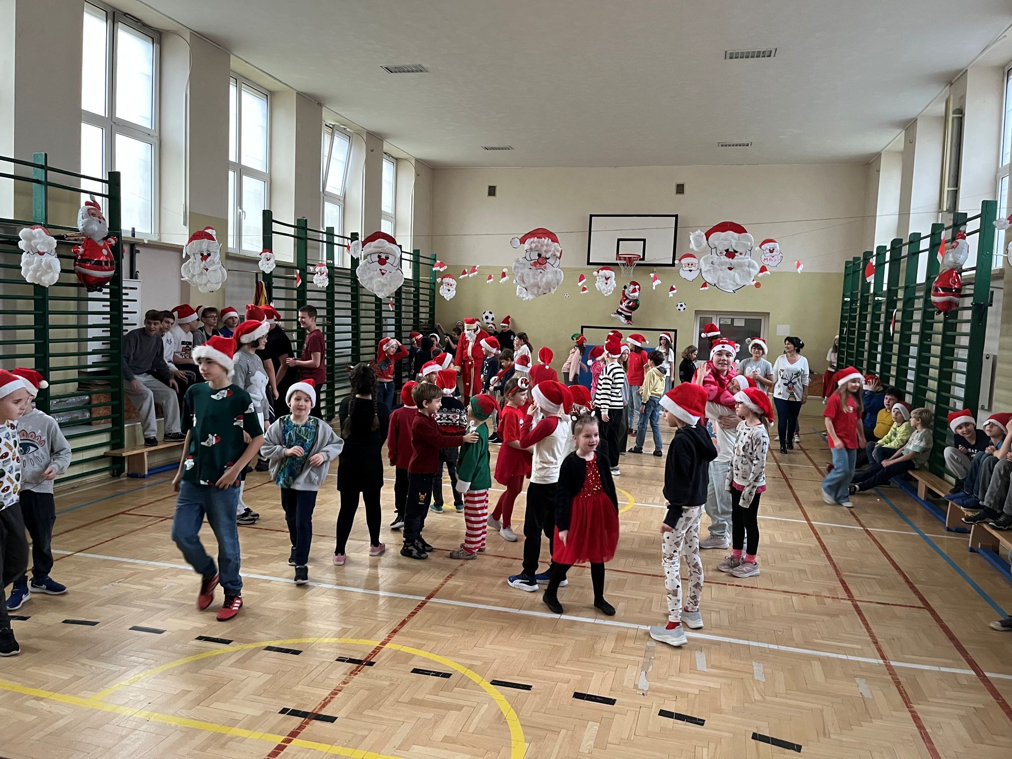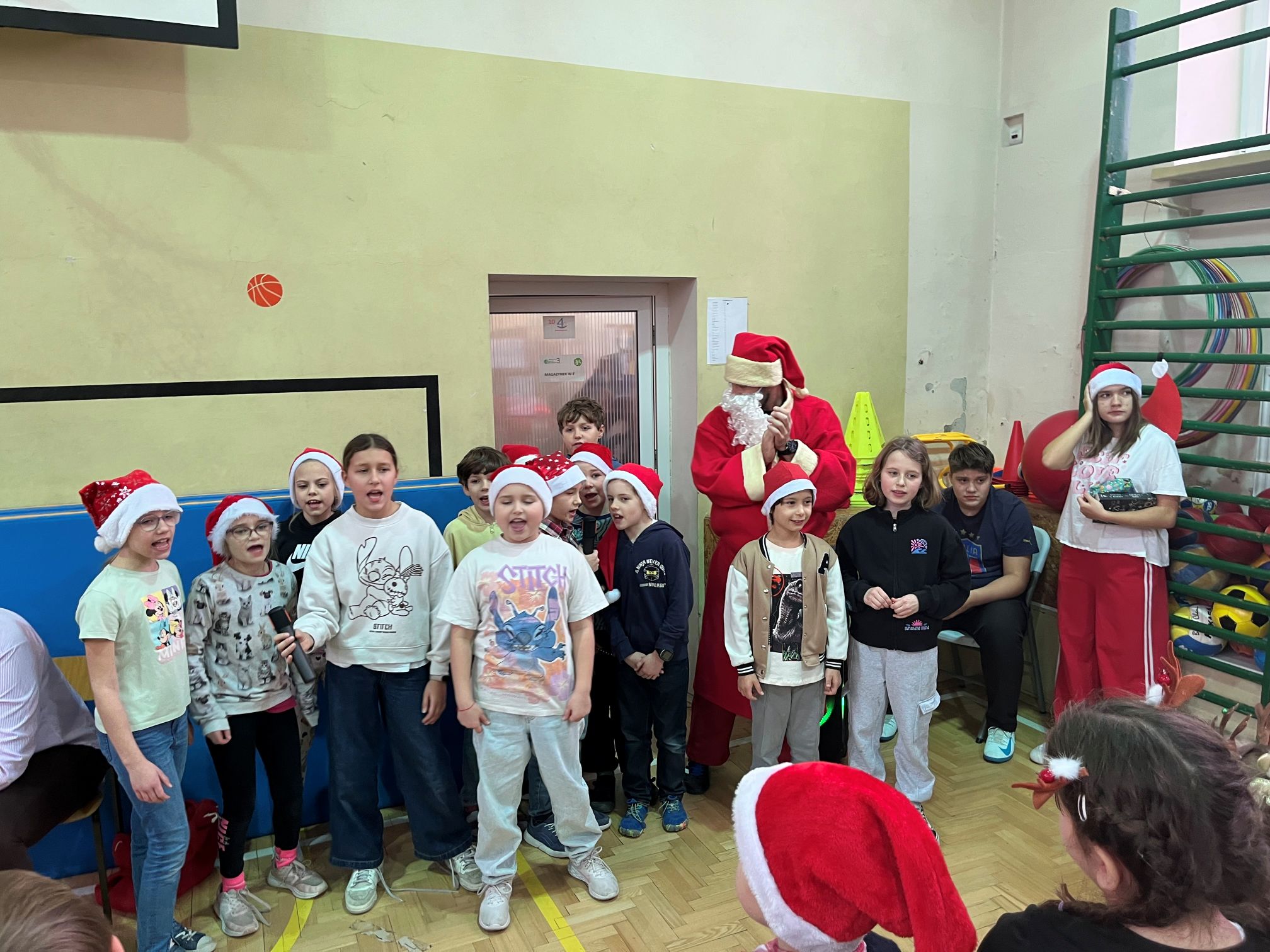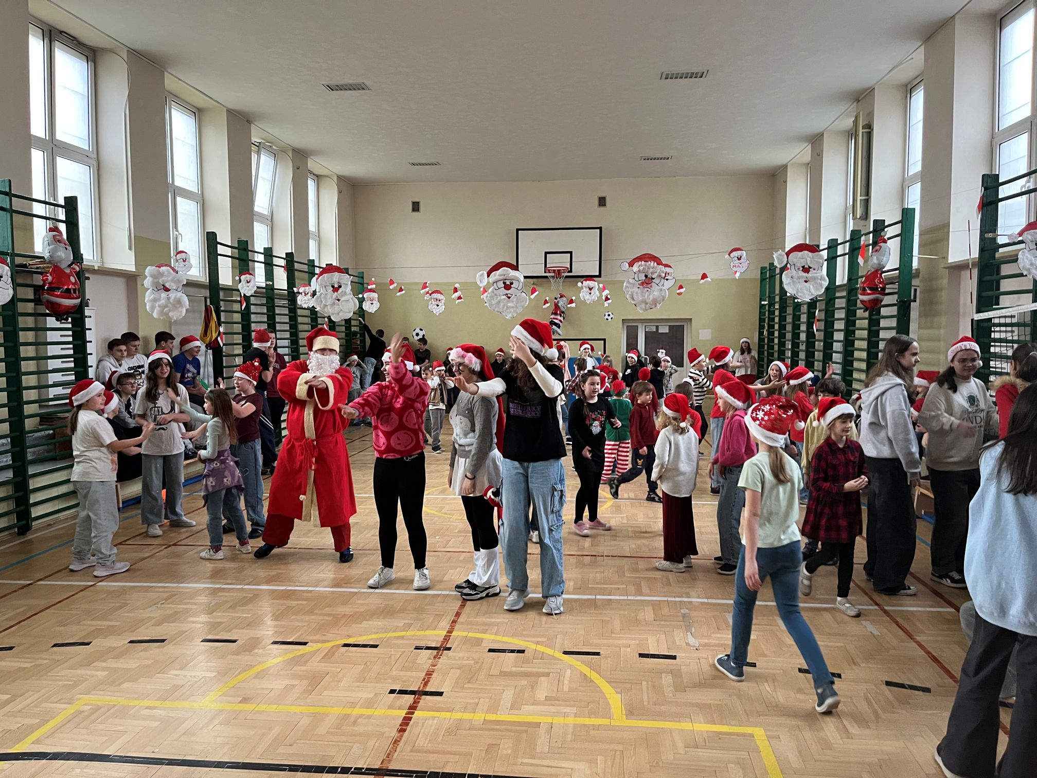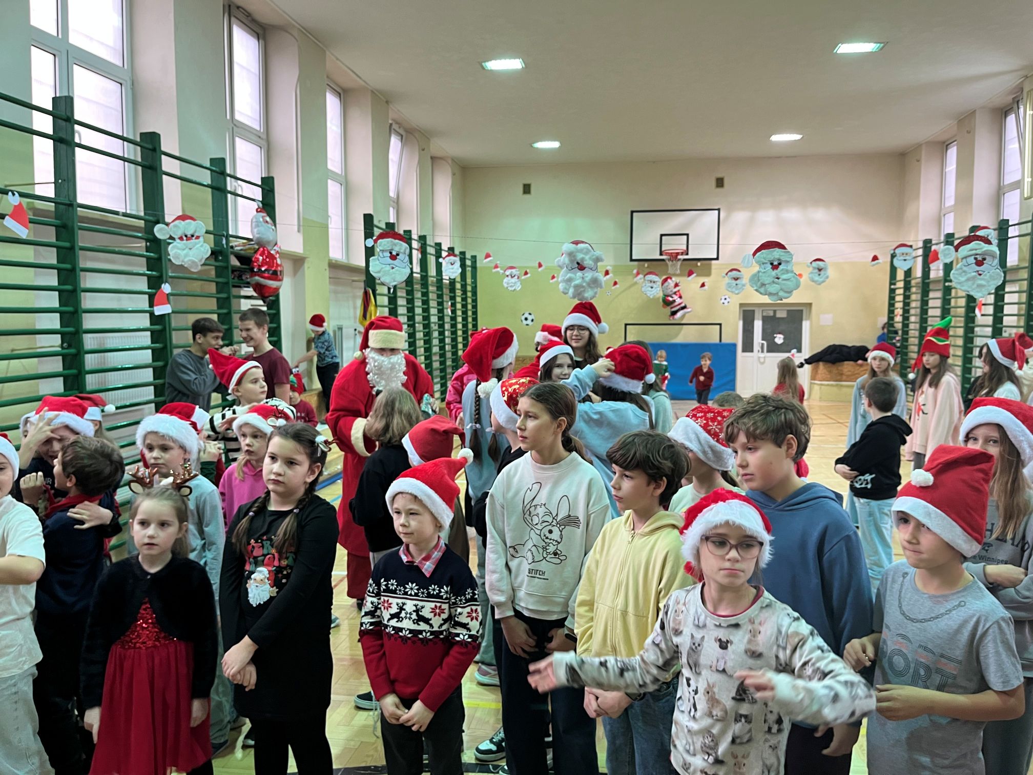 Mikołaj szybko dał się porwać rytmom muzyki i zatańczył z naszymi uczniami niejedną piosenkę. Po wspólnej zabawie rozpoczęło się długo wyczekiwane rozdawanie prezentów dla wszystkich klas. W ramach podziękowania uczniowie zaśpiewali dla Mikołaja świąteczne piosenki, tworząc wyjątkowy, pełen radości klimat.