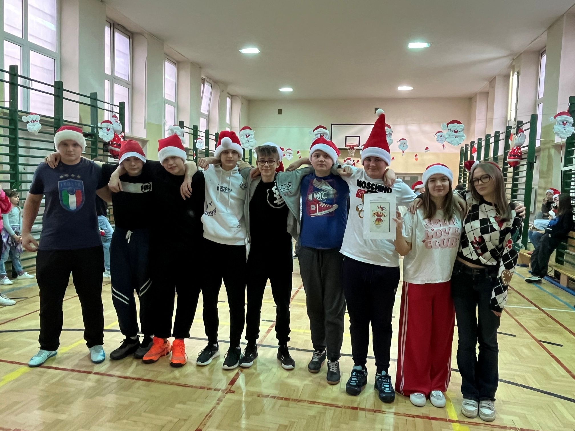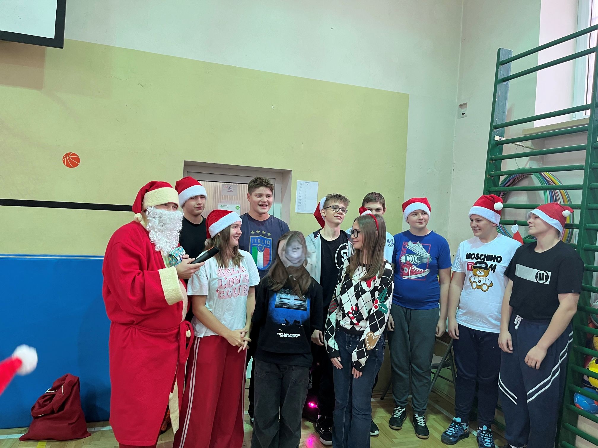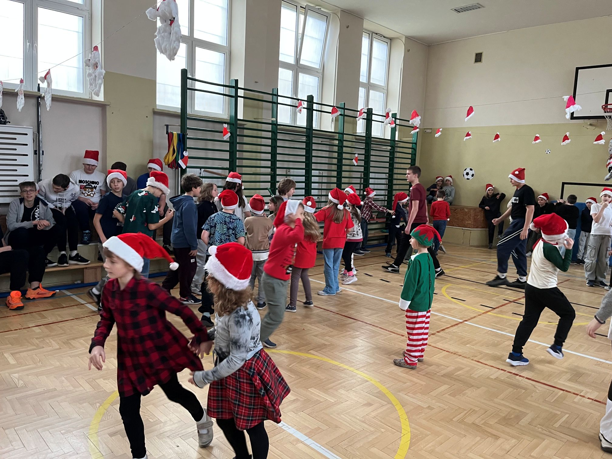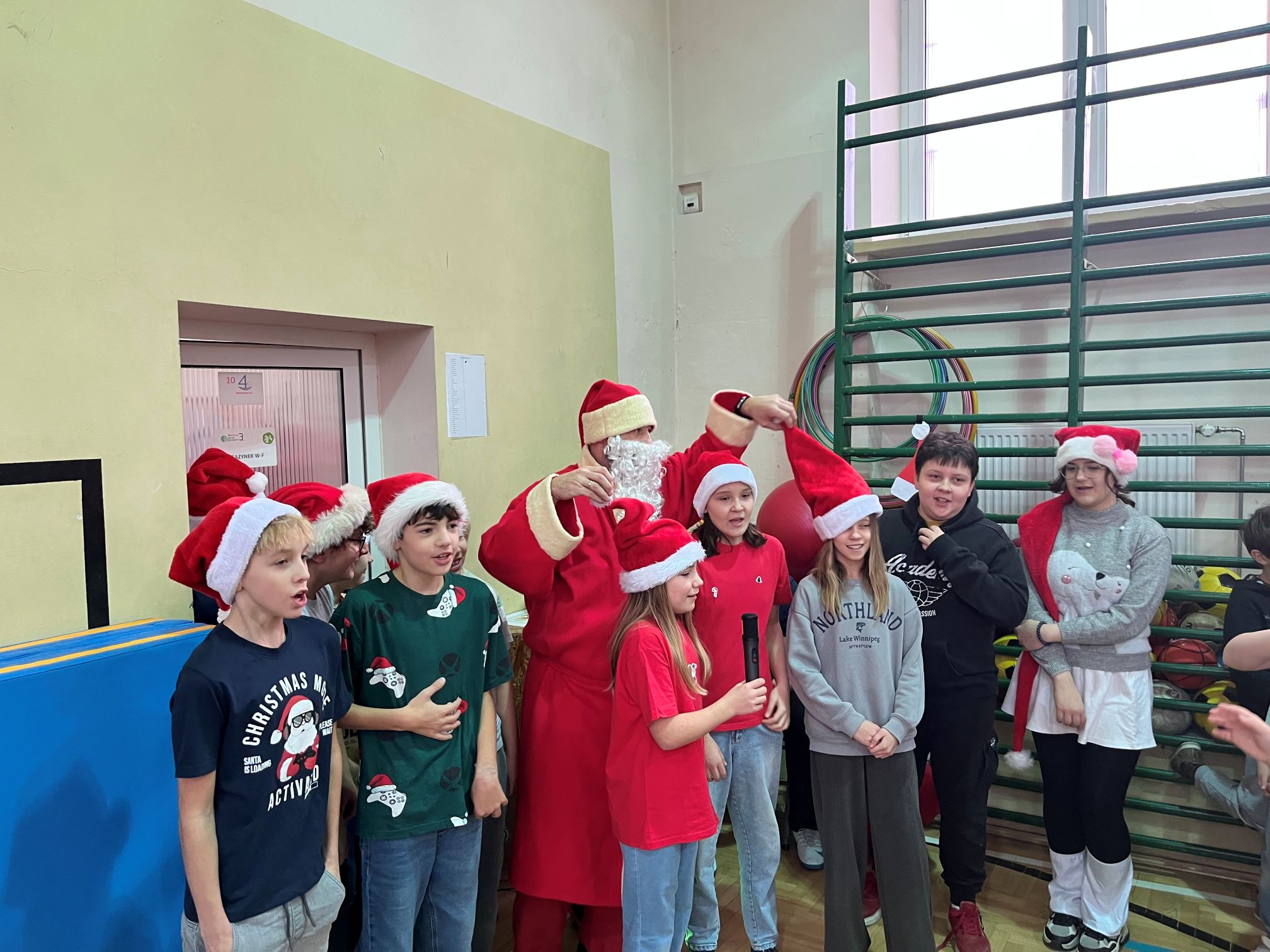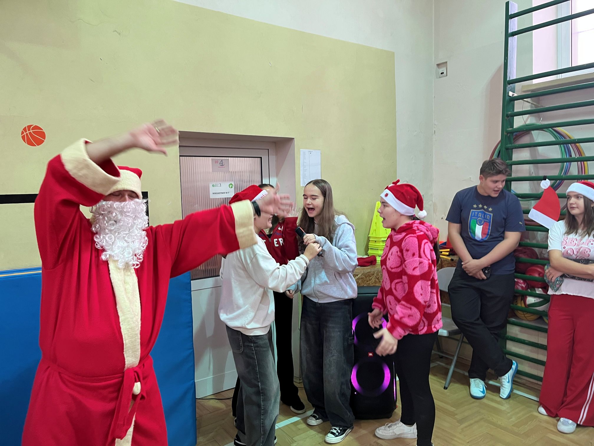 Mikołaj szybko dał się porwać rytmom muzyki i zatańczył z naszymi uczniami niejedną piosenkę. Po wspólnej zabawie rozpoczęło się długo wyczekiwane rozdawanie prezentów dla wszystkich klas. W ramach podziękowania uczniowie zaśpiewali dla Mikołaja świąteczne piosenki, tworząc wyjątkowy, pełen radości klimat.