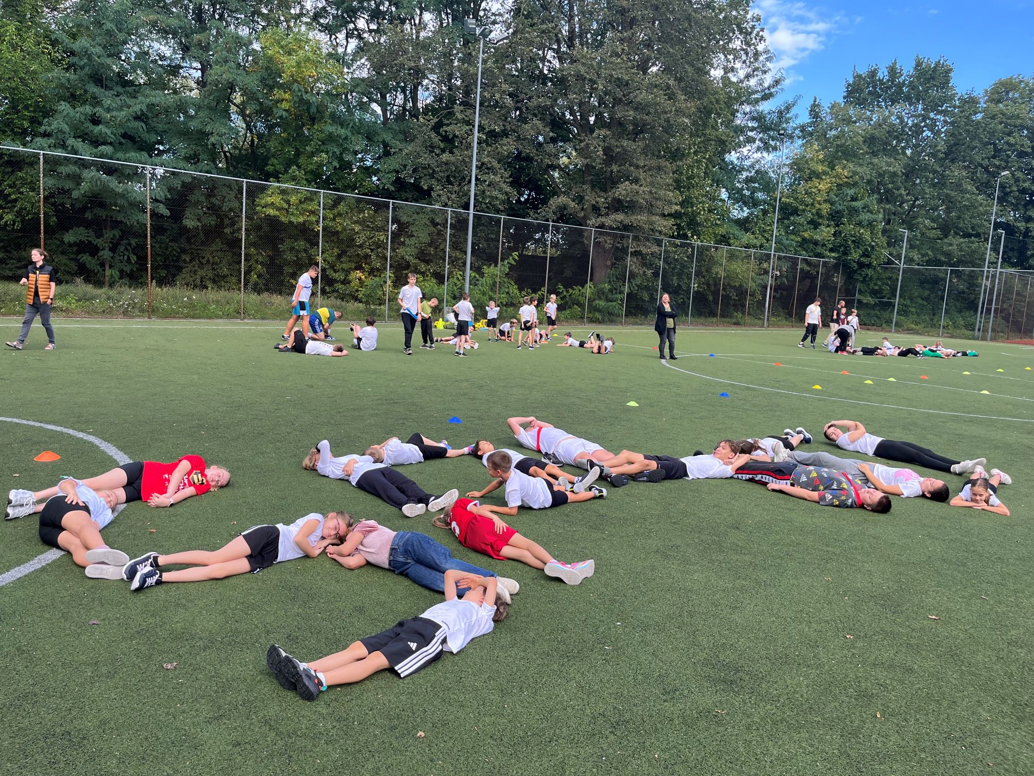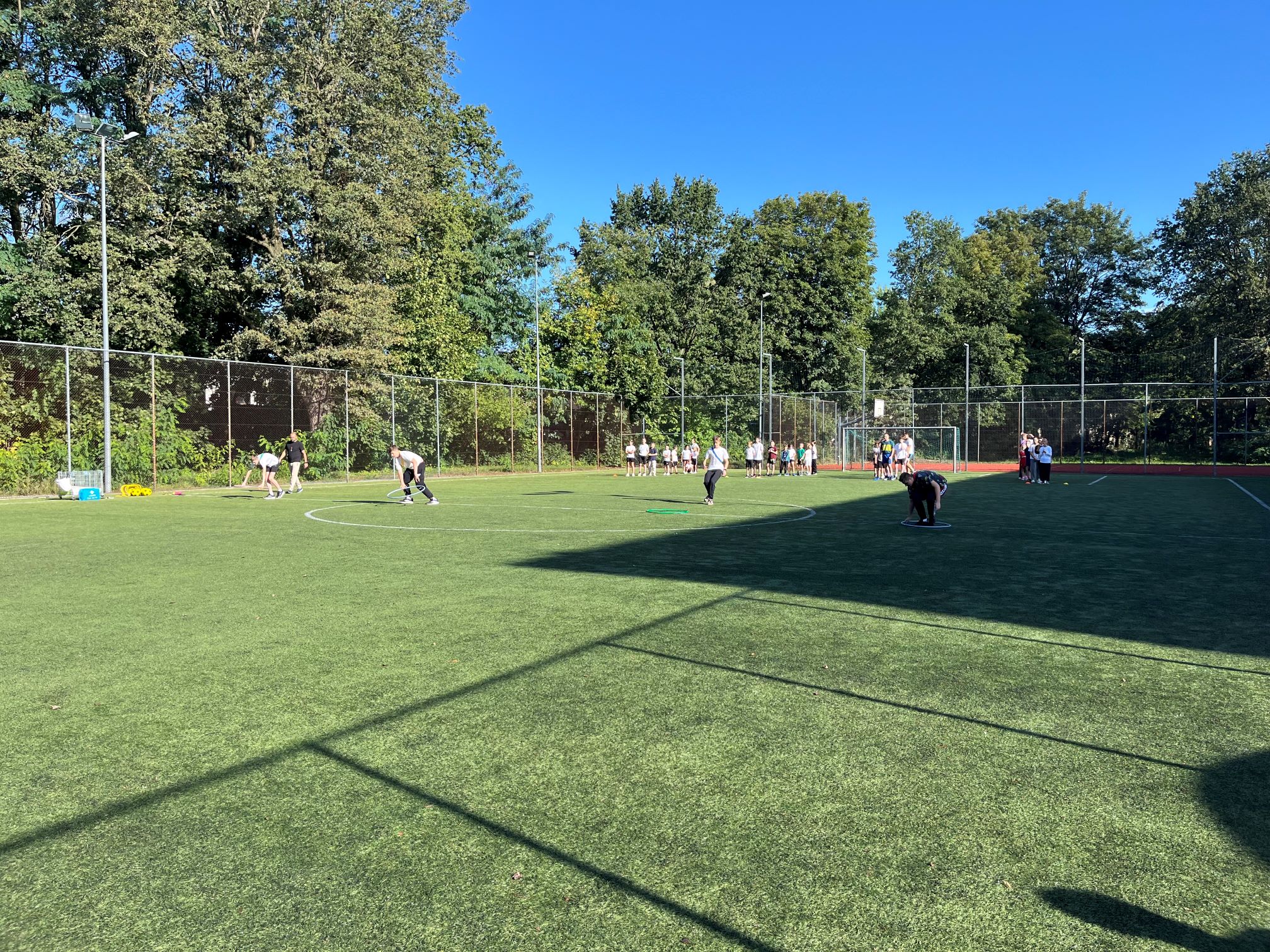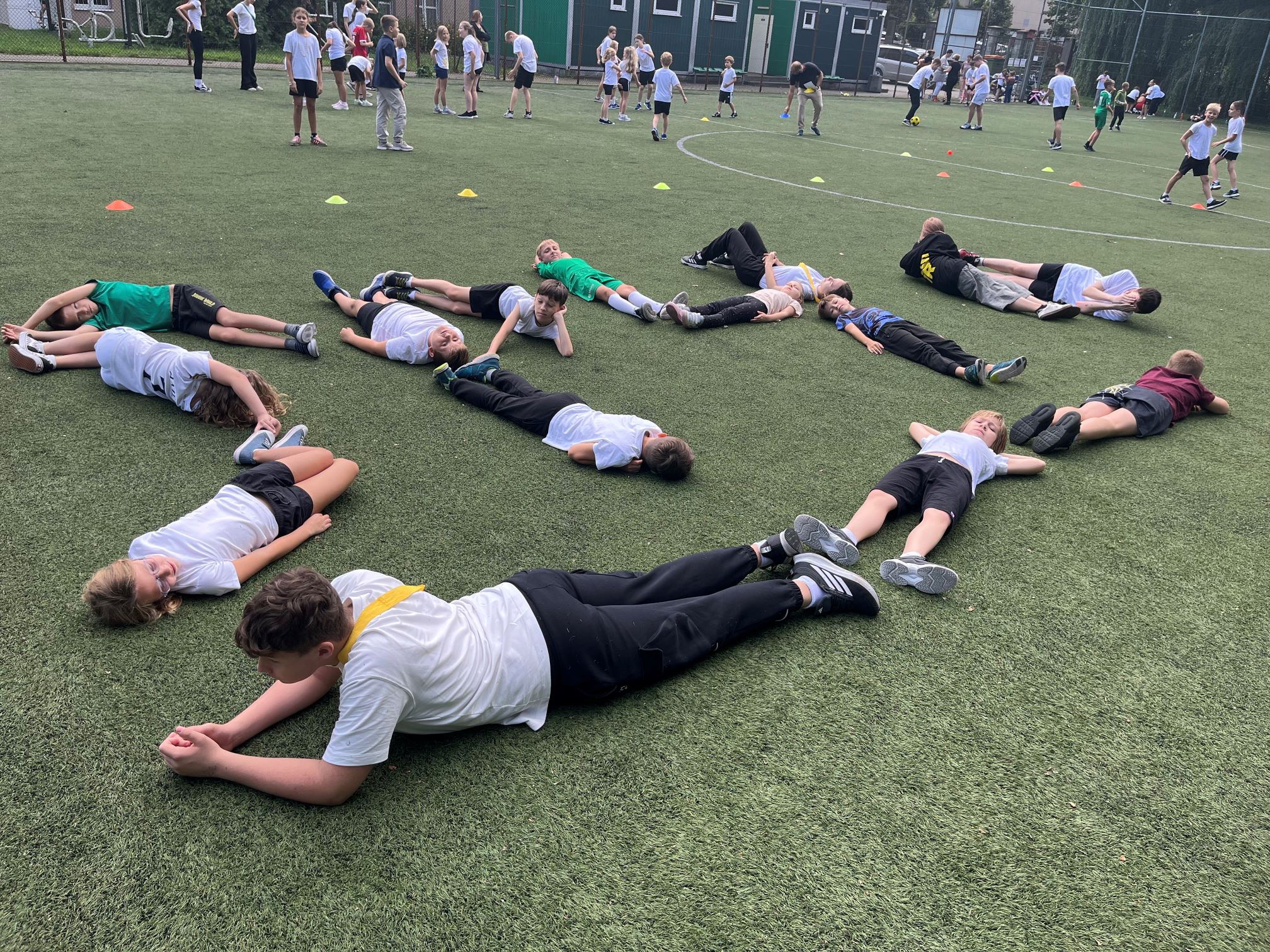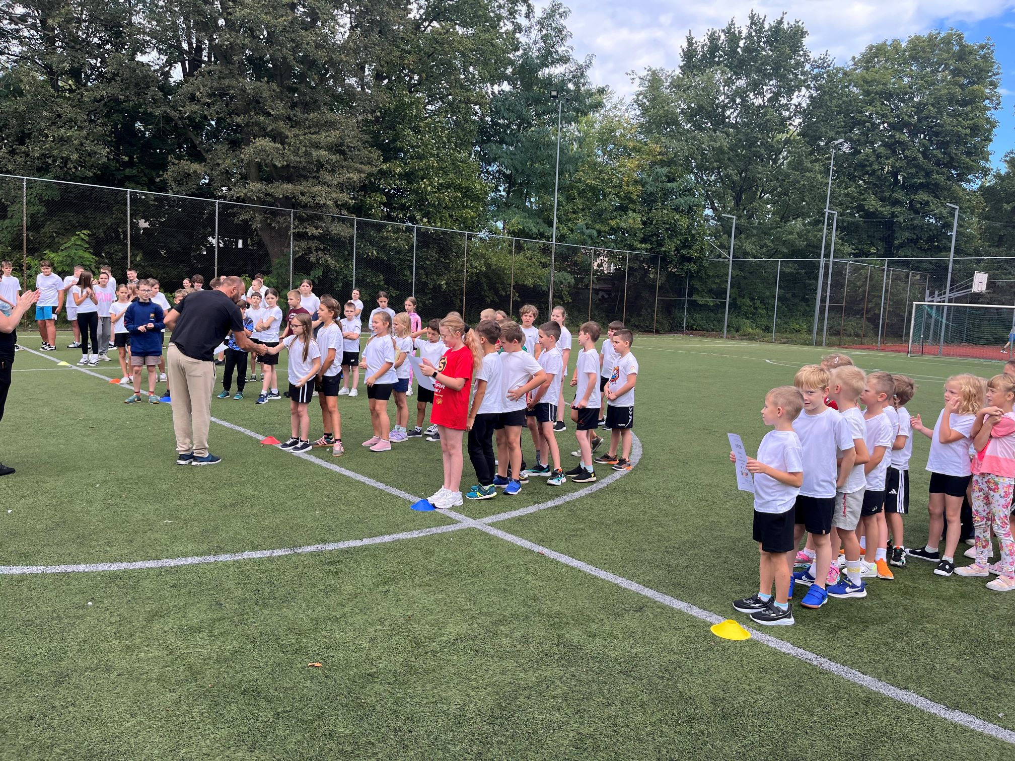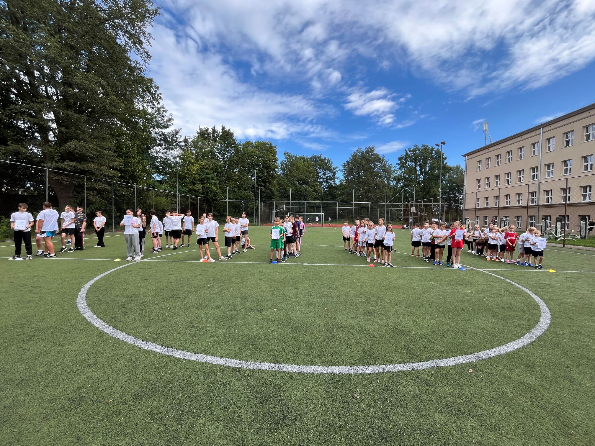 Cała szkoła udała się na pobliski Orlik, gdzie dzień rozpoczęliśmy wspólną rozgrzewką w promieniach słońca. Następnie uczniowie zostali podzieleni na drużyny i rywalizowali w różnych konkurencjach sportowych. Było dużo emocji, energii i radości – uczniowie wykazali się szybkością, precyzją i sprytem.